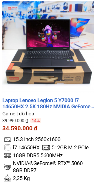 - » [TOP 2]Laptop Lenovo Legion 5 Y7000 i7 14650HX 2.5K 180Hz NVIDIA GeForce RTX 5060 8GB