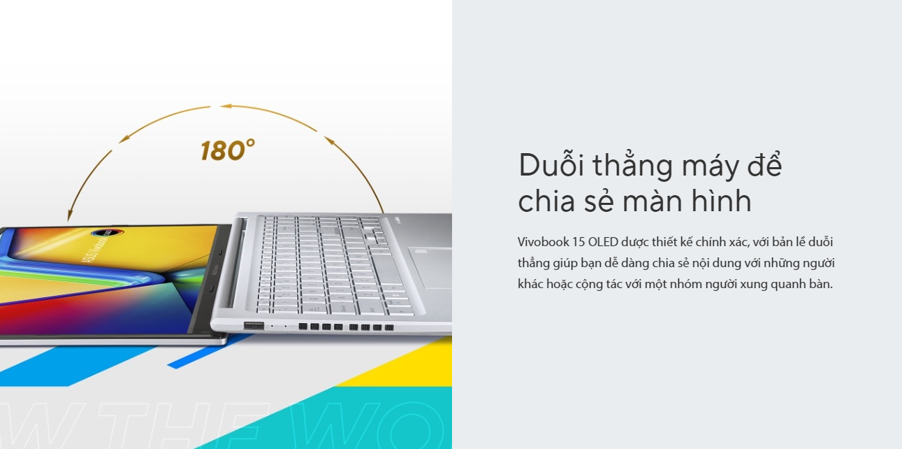 Điểm đáng mua của màn hình laptop này là sử dụng công nghệ OLED, cho phép màn hình có độ sáng cao, độ tương phản cao, dải màu rộng và góc nhìn rộng. Màn hình OLED của laptop ASUS Vivobook 15 OLED có độ sáng tối đa lên đến 600 nit, dải màu DCI-P3 100%, sRGB 100%, tỷ lệ tương phản 1.000.000:1 và thời gian đáp ứng chỉ 0,2 ms. Thêm vào đó, máy cũng có chứng nhận VESA cho phép màn hình hiển thị hình ảnh HDR với độ sâu màu sắc và độ chi tiết cao và chứng PANTONE Validated có khả năng tái hiện màu sắc chính xác và chuẩn xác theo tiêu chuẩn quốc tế.