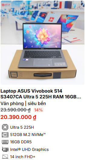 » [TOP 1]Laptop ASUS Vivobook S14 S3407CA Ultra 5 225H RAM 16GB M2.SSD 512GB FHD
