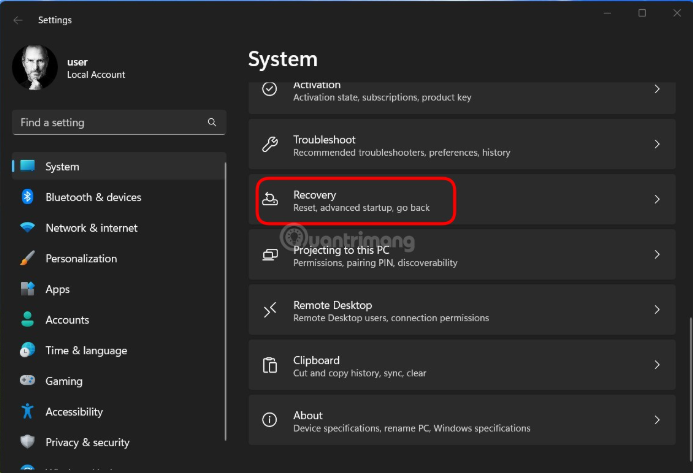 Trên trang cài đặt “System”, hãy nhấp vào “Recovery”.