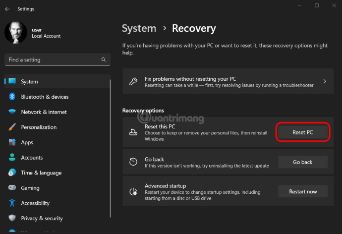 Trong menu “Recovery”, bên trong tùy chọn “Reset this PC”, bạn nhấp chọn “Reset PC”.