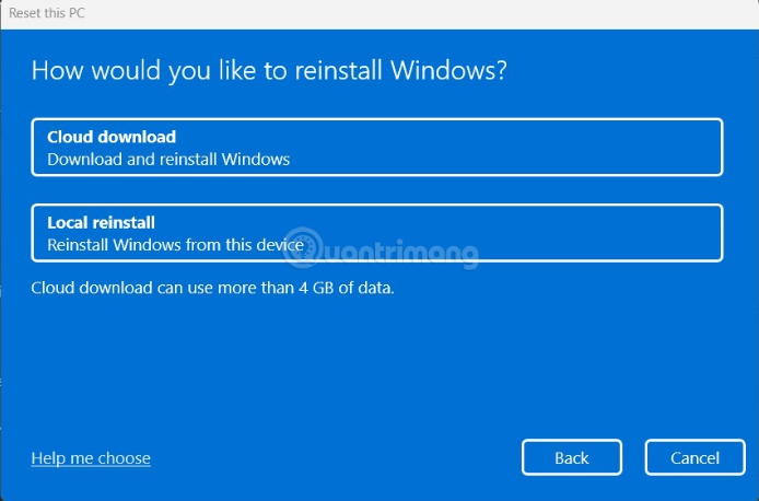 Sau khi bạn chọn 1 tùy chọn, màn hình “How Would You Like to Reinstall Windows” sẽ hiện ra. Nếu bạn muốn cài đặt lại Windows 11 từ đám mây, hãy chọn “Cloud Download”. Trong trường hợp bạn muốn thực hiện cài đặt cục bộ như truyền thống, hãy chọn tùy chọn “Local Reinstall”.