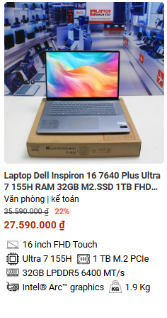 » [TOP 3]Laptop Dell Inspiron 16 7640 Plus Ultra 7 155H RAM 32GB M2.SSD 1TB FHD Cảm ứng