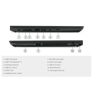 • Cổng giao tiếp: 2 x USB-A 3.1 Gen 1 | USB-C AC power | USB-C Thunderbolt™ 3 | HDMI 1.4b | MicroSD card reader | Smart card reader (SD, SDHC, SDXC) | RJ45 | Headphone / mic combo