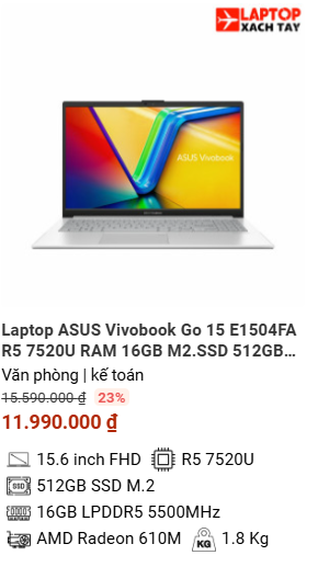 - Với mức giá chỉ ở phân khúc 10 triệu đồng nhưng Laptop Asus E1504FA lại trang bị cho mình cấu hình khá ổn với CPU R5 cùng Ram 16GB, trong khi bộ nhớ tới 512GB SSD. Đáp ứng đầy đủ nhu cầu của 1 chiếc laptop học sinh sinh viên.