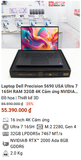 - » [TOP 5] Laptop Dell Precision 5690 USA Ultra 7 165H RAM 32GB 4K Cảm ứng NVIDIA® RTX™ 2000 Ada 8GB GDDR6 M2.SSD 1TB