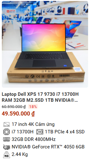 - » [TOP 4]Laptop Dell XPS 17 9730 i7 13700H RAM 32GB M2.SSD 1TB NVIDIA® GeForce RTX™ 4050 6GB 4K Cảm ứng